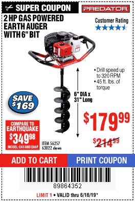PREDATOR Gas Powered Earth Auger for $179.99 - Harbor Freight Coupons Buy the PREDATOR Gas Powered Earth Auger (Item 56257) for $179.99 with coupon code 30271430, valid through June 30, 2020. See the coupon for details. Compare our price of $179.99 to Earthquake at $439.98 (model number: E43, EA6F). Save $259 by shopping at Harbor Freight. Meet the PREDATOR Gas Powered Earth Auger.